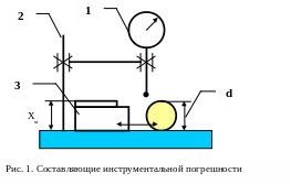 Так при измерении диаметра d детали индикатором часового типа на стойке (рис. 1), инструментальные погрешности складываются из погрешностей самой измерительной головки 1, погрешностей стойки 2 и погрешностей блока плоскопараллельных концевых мер длины 3, на который настраивался прибор. В свою очередь каждую из приведенных инструментальных составляющих погрешности измерения можно разбить на элементарные составляющие. Например, погрешность измерительной головки 1 включает в себя множество составляющих, которые зависят от ее конструкции; погрешности составляющих элементов стойки 2 приводят к неправильному ориентированию прибора и детали; погрешности блока плоскопараллельных концевых мер длины 3, на который настраивался прибор, определяются погрешностями каждой из мер блока и погрешностями их притирки.