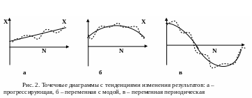 Чаще всего аппроксимация простейшими линиями оказывается достаточно эффективной, но не исключаются и возможные уточнения, например использование параболы или экспоненты для описания участка прогрессирующих данных или наложение синусоиды на наклонную прямую линию. Однако при этом следует иметь в виду, что стремление к высокой точности в подборе аппроксимирующей линии не имеет смысла, поскольку не гарантирована строгость соответствия точечной диаграммы допущениям, положенным в основу ее построения. Как показывает опыт анализа точечных диаграмм, незначительные различия при моделировании систематических тенденций разными исследователями приводят к погрешностям второго порядка малости и не оказывают значимого влияния на результаты таких числовых оценок как среднее квадратическое отклонение.
