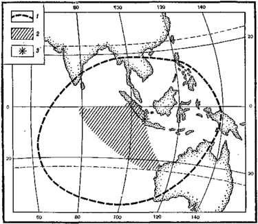 1 –зона распространения звука взрыва; 2 –площадь пеплопада; з –вулкан Кракатау