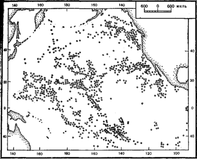 За пределами этих четырех вулканических поясов вулканы на материках почти не встречаются. На обширных пространствах Центральной и Северной Европы, в большинстве районов Азии, в Австралии, в Северной и Южной Америке, исключая Тихоокеанское кольцо, их нет. Но вот в океанах картина совершенно иная. Проведенное в последние два десятилетия подробное изучение рельефа океанического дна показало, что на дне всех без исключения океанов имеется огромное число крупных вулканических построек. Особенно много их обнаружено на дне Тихого океана (рис. 3). Самой интересной особенностью большинства подводных вулканов является то, что вершины у них плоские. Ученые установили, что такие плоские вершины вулканов образовались тогда, когда эти вулканы выступали из воды. Волны размыли торчащий из воды конус, образовав почти ровную поверхность. Впоследствии дно океана погрузилось, и эти вулканы без вершин, называемые гийотами, оказались под водой.