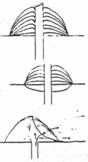вначале эффузивное излияние магмы, обр вулк конус, потом вулк пробка. Происходит эксплозивное извержение (взрыв), кот не разрушает пробку. Дальше происходит экструзивное извержение