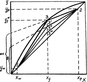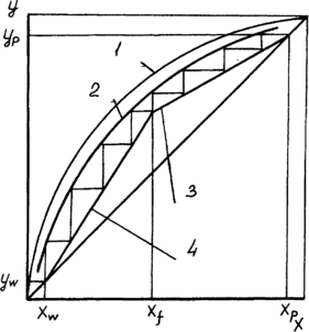 При известной кинетической линии число реальных тарелок, которое обеспечивает заданную четкость разделения, определяют путем построения ступенчатой линии между рабочей и кинетической. Ступенчатую линию строят от концентрации Xf к Хр и от концентрации Xf к Xw. Число ступеней в пределах концентрации Xf - Хр равно числу реальных тарелок в укрепляющей секции колонны, а число ступеней в пределах концентраций Xf— Xw равно числу реальных тарелок в исчерпывающей секции колонны (рис.8).