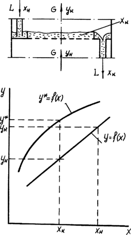 На рис.7 приведена схема изменения концентраций на тарелке. Пар концентрации ун поступает на тарелку и взаимодействует с жидкостью, находящейся на ней. В процессе движения через слой жидкости пар постепенно изменяет свою концентрацию от Ун до Ук. Жидкость приходит на тарелку с концентрацией x„. На тарелке она полностью перемешивается и имеет постоянный состав, равный Хк. С концентрацией Хк жидкость сливается с тарелки.