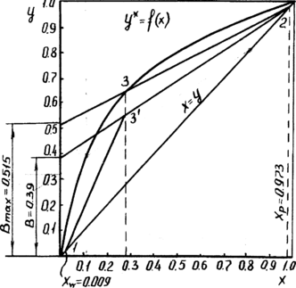 Отрезки В откладываем на диаграмме у-х (рис. 15). Соединяя верхние точки отрезков В на диаграмме с точкой 2, получаем ряд рабочих линий верхней части колонны (например, дляК==1,5 линия 2-3').