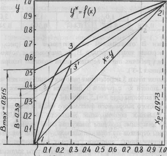 Из точки 2 (пересечение диагонали квадрата у-х с абсциссой Хр=0,973) проводим через точку 3 прямую до пересечения с ординатой диаграммы. На оси ординат получаем отрезок равный В^х-0,515.