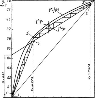 На диаграмме (см. рис.18) откладываем отрезки у*-у к от равновесной линии вниз, полученные точки соединяем плавной линией Г-3'-2\ Построенная кривая является кинетической кривой.