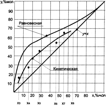 2. По значениям х2 х3...х8 строят в координатах Y-X кинетическую линию процесса. Предварительно наносят равновесную кривую и рабочую линию (Y-X), являющуюся диагональю квадрата диаграммы Y-X (рис.3.5).