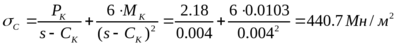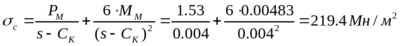 Суммарные напряжения сжатия в корпусе аппарата при толщине стенки s-CK = 0,004 м в месте присоединения лапы (сверху) определяем: