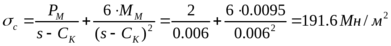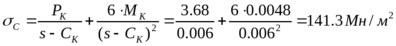 Суммарные напряжения сжатия в корпусе аппарата при толщине стенки s-CK = 0,006 м в месте присоединения лапы (сверху) определяем: