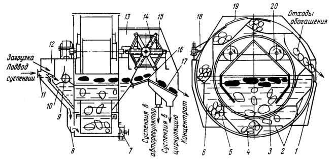 1 – корпус; 2 – откидные лопасти ковшей элеваторного колеса; 3 – загрузочные окна ковшей элеваторного колеса; 4,5 – ковши элеваторного колеса; 6 – элеваторное колесо; 7 – устройство для выпуска суспензии; 8 – карман для подачи суспензии; 9 – лопастной погружатель для исходного угля; 10 – жалюзийная решетка для равномерного распределения транспортного потока суспензии; 11 – патрубок для подвода суспензии; 12 – загрузочный жёлоб с течкой; 13 – кожух желоба для выгрузки отходов; 14 – механизм для выгрузки отходов; 15 – лопасти ; 16 – порог;