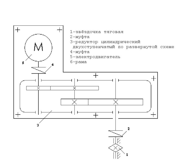 После включения электродвигателя через муфту упругую втулочно-пальцевую крутящий момент предается на входной (быстроходный) вал редуктора. В редукторе частота вращения вала и переданный крутящий момент преобразуются, частота вращения вала понижается, а крутящий момент на валу возрастает. Таким образом, частота вращения на выходном (тихоходном) валу меньше, чем на входном, зато крутящий момент, передаваемый на звёздочку, больше.