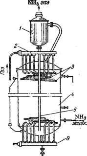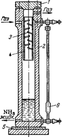 Внутри цилиндра на металлических стержнях укреплены отбойники 3, представляющие собой стальные полудиеки, повернутые друг к другу под углом 30°. Уносимые газом брызги жидкого аммиака ударяются об отбойники и стекают вниз. Газ, освобожденный от жидкости, выходит из сепаратора через верхнее отверстие, жидкий аммиак удаляется из аппарата снизу. Для предотвращения прорыва газа в жидкостной трубопровод (что очень опасно) в сепараторе всегда поддерживается определенный уровень жидкого аммиака при помсщи регулятора уровня, получающего соответствующий импульс от бхйковой камеры 6.