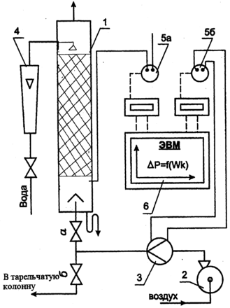 Воздух воздуходувкой 2 через измеритель расхода 3 подается в колонну 1. Вентилем а регулируют подачу воздуха. При испытании неорошаемой колонны вода не поступает; при обследовании орошаемой колонны через ротаметр 4 подается определенный расход воды. Дифференциальные манометры 5а и 56 замеряют соответственно перепад давления в колонне и расход подаваемого воздуха. В ЭВМ эта информация преобразуется и выдается в цифровом и графическом виде зависимости гидравлического сопротивления неорошаемой насадки от скорости воздуха в колонне.