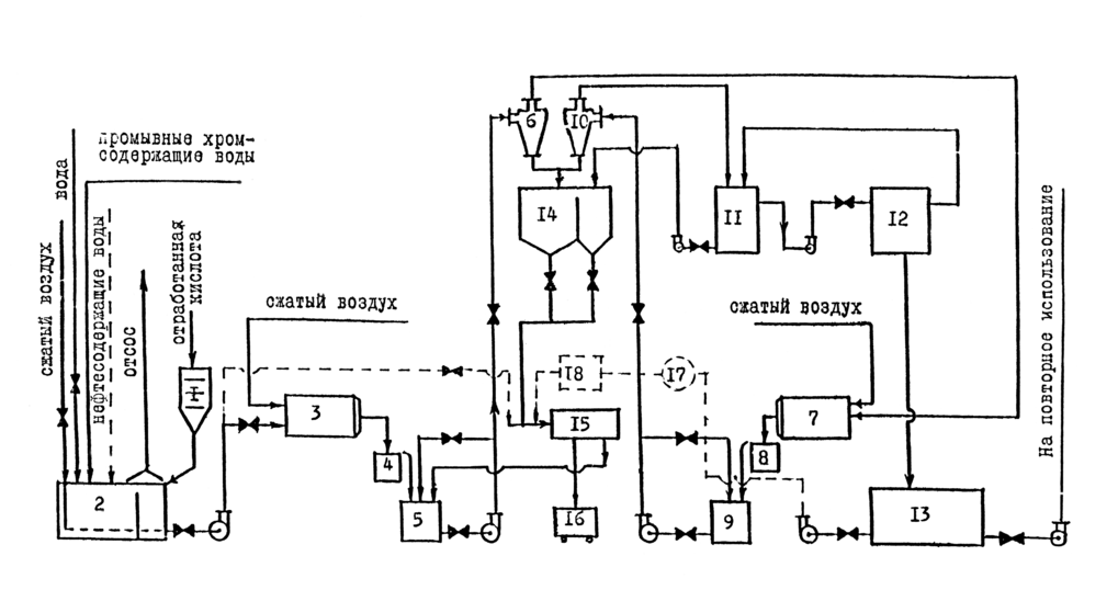 12-микрофильтрационная установка; 13- емкость-накопитель очищенной воды; 14-шламоуловитель; 15-центрифуга; 16-сборник обезвоженного осадка; 17-эжектор; 18-абсорбер.