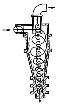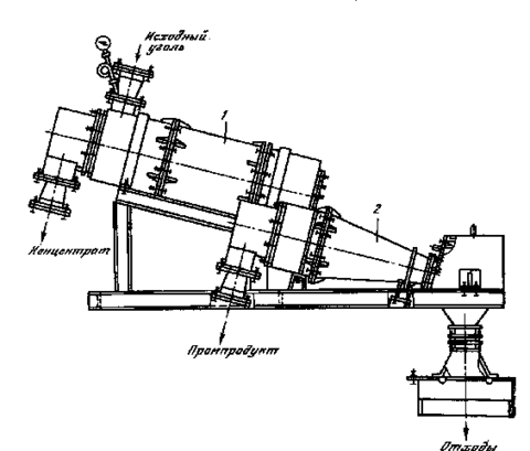 Схема устройства трехпродуктового тяжелосредного гидроциклона