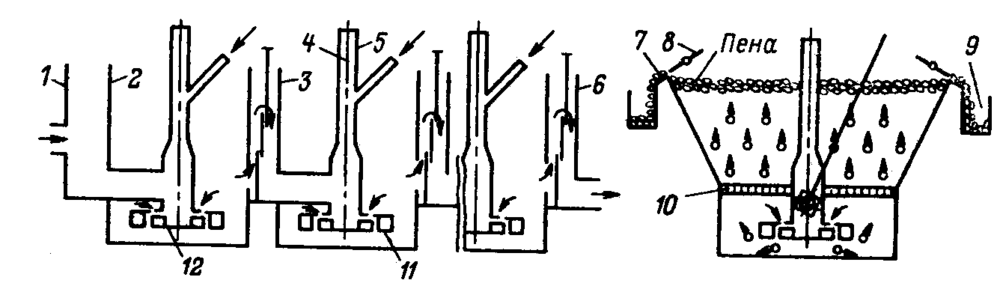 8 – пеногон; 9 – жёлоб для пены; 10 – успокоительная решётка; 11 – статор; 12 – импеллер
