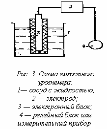 Принципиальная схема емкостного уровнемера показана на рис. 3. В сосуд с жидкостью 1, уровень которой необходимо измерять, опущен электрод 2, покрытый изоляционным материалом. Электрод вместе со стенками сосуда образует цилиндрический конденсатор, емкость которого меняется при колебаниях уровня жидкости. Величина емкости измеряется электронным блоком 3, который затем подает сигнал в блок 4, представляющий собой релейный элемент в схемах сигнализации достижения определенного уровня или указывающий прибор в схемах измерения уровня.