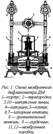 Давления передаются через импульсные линии 3 и 10, на которых установлены два запорных вентиля 6 и 7 и уравнительный вентиль 8. С центром верхней мембраны связан сердечник 9 дифференциально-трансформаторной катушки 4, закрытой колпаком 5.