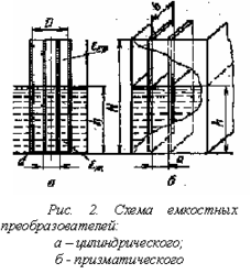 Цилиндрический емкостный преобразователь (рис. 2) представляет собой две (или несколько) коаксиально расположенные трубы, две (или несколько) плоские (рис. 2б) параллельно расположенные пластины, между которыми на высоте h находится жидкость.