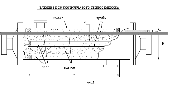 Задание для расчета. Определить требуемые площадь поверхности теплообмена кожухотрубчатого теплообменного аппарата (рис.1.) и суммарную на прокачивание теплоностителей по его каналам N для охлаждения горячего теплоносителя с массовым расходом температуры t1’ на входе в теплообменный аппарат до температуры t1” на выходе из него. Температура холодного теплоносителя (воды) изменяется от t2’ на входе в теплообменный аппарат до t2’’ на выходе из него. Горячий теплоноситель движется внутри n труб с внутренним диаметром d равным 14 мм. Толщина стенки труб равна 1мм. Вода обтекает трубы теплообменного аппарата снаружи продольно, двигаясь в межтрубном кнале, образованном поверхностями труб и кожухом с внутренним диаметром D.
