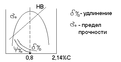 Зарисовать графики влияния содержания углерода на свойства стали.