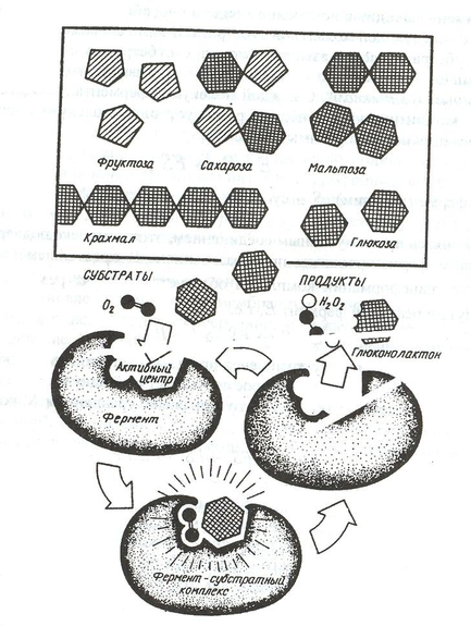 Вышеуказанное хорошо иллюстрируется примером извлечения из раствора глюкозы различными микроорганизмами, содержащими фермент глюкозооксидазу в среде с молекулярным кислородом. Глюкозооксидаза образует фермент-субстратный комплекс - глюкоза - кислород - глюкозооксидаза, после распада которого образуются промежуточные продукты - глюконолактон и пероксид водорода, как это схематично показано на рис. 1. Образовавшийся в результате распада указанного комплекса глюконолактон подвергается гидролизу с образованием глюконовой кислоты. Суммарно обе эти реакции можно выразить уравнением: