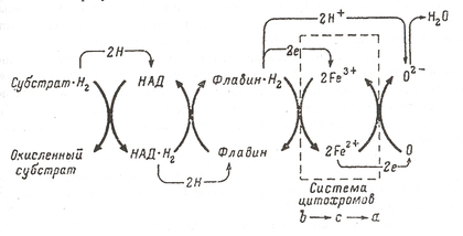 Наибольшее количество энергии для своего функционирования клетка получает в результате окисления кислородом водорода, отщепляемого от окисляемого субстрата под действием ферментов-дегидрогеназ, которые по своему химическому действию делятся на никотинамидные (НАД) и флавиновые (ФАД). Никотинамидные дегидрогеназы первыми реагируют с субстратом, отщепляя от него два атома водорода и присоединяя их к коферменту. В результате этой реакции субстрат окисляется, а НАД восстанавливается до НАДНг. Далее в реакцию вступает ФАД, перенося водород с никотинамидного кофермента на флавиновый, в результате чего НАД Н2 снова окисляется до НАД, а флавиновый - восстанавливается до ФАД Нг. Далее через чрезвычайно важную группу окислительно-восстановительных ферментов-цитохромов — водород передается молекулярному кислороду, что и завершает процесс окисления с образованием окончательного продукта - воды. В этой реакции последний цитохром (цитохромоксидаза), обладающий способностью вступать в реакцию непосредственно с кислородом, передает ему электроны и тем самым активирует его, т.е.