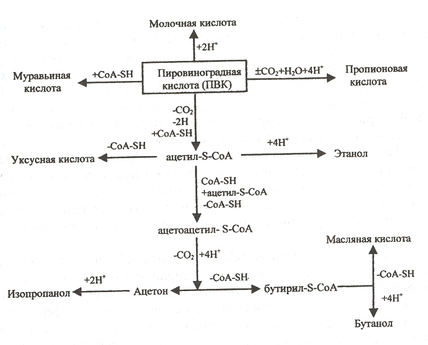 Рис. 4. Превращение пировиноградной кислоты анаэробными микроорганизмами в различные продукты