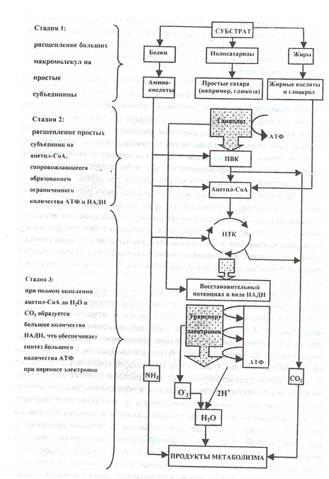 Рис.3. Упрощенная схема трехстадийного распада молекул питательных веществ (Б.Альбертс и др. 1986)