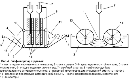 Струйный биофильтр работает следующим образом. Сточные воды, прошедшие механическую очистку, попадают в аэрационную зону, куда также поступает смесь осветленной жидкости и циркуляционного активного ила. Эта смесь из нижней части осветляется забирается по трубопроводу насосом и через струйный аэратор шахтного типа сбрасывается в аэрационную зону биофильтра. Струя потока вводится в межсекционное пространство (Рис. 8) ниже свободной поверхности на 15-30 см и отражается от специально спланированной поверхности дна. В результате возникают интенсивные воздушные восходящие потоки, которые приводят к движению биоротора.