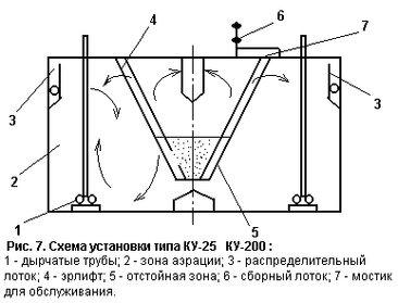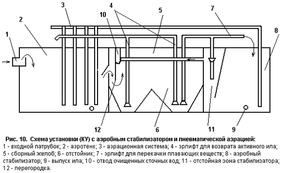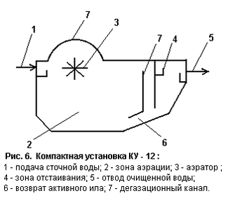 На рис. 13 показана схема компактной установки (КУ) с аэробной стабилизацией или пневматической аэрацией.