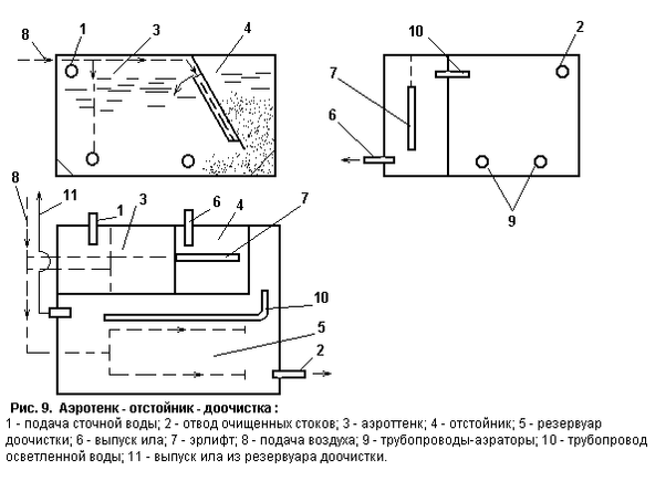 Сточная вода поступает в зону аэрации по трубопроводу диаметром 100 мм, туда же попадает воздух от воздуходувки и циркуляционный активный ил с помощью эрлифта. По истечении периода биологической очистки активный ил со сточной водой поступает во вторичный отстойник, где происходит осветление стоков. Активный ил, находящийся главным образом в нижней части отстойника, эрлифтом подсасывается и перекачивается в зону аэрации. Избыточный активный ил периодически удаляется из зоны аэрации через илопровод диаметром 100 мм на иловые площадки. Осветленная вода поступает по трубопроводу из отстойной зоны в сооружения доочистки стоков. В качестве сооружения доочистки могут быт использованы биореакторы с затопленной загрузкой, либо эту часть сооружений можно использовать как нитрификатор - денитрификатор. Выбор сооружения доочистки зависит от местных условий и требований качества очищенного стока. В каждом конкретном случае необходима частичная реконструкция сооружения доочистки.