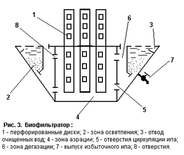 В сорбционной зоне установлены вращающиеся перфорированные диски из пенопласта или подобных материалов. Диски вращаются мотор-редукторм с частотой вращения 10-15 об/мин. За счет градиента давления жидкость и отторгнутая биопленка переливаются через отверстие, устроенное в разделительной перегородке. Укрупненные хлопья активного ила из зоны осветления опускаются вниз и через отверстия подсасываются в аэрационную зону за счет кинематики течения. Таким образом, происходит постоянный обмен биомассы между зонами сорбции и осветления. Очищаемая жидкость поднимается к лотку и отводится за пределы сооружения.