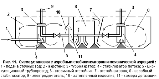На рис.14 показана схема установки с аэробной стабилизацией активного ила и механическими аэраторами. Эти сооружения выполняют в блочном варианте что позволяет набирать необходимую производительность (700-400 куб.м в сутки и более).