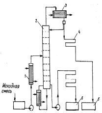 вателя исходной смеси 1, сборников дистиллята 5 и кубового остатка 6. Дефлегматор, холодильник и подогреватель представл собой обычные теплообменники. Основным узлом установки является ректификационная колонна, в которой пар поднимается снизу вверх, а сверху вниз стекает жидкость, подаваемая в верхнюю часть аппарата в виде флегмы. В большинстве случаев конечными продуктами являются дистиллят