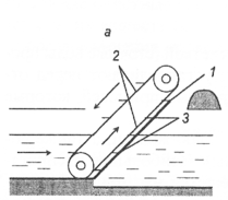 Решетки очищают граблями1 — решётка; 2 — бесконечная цепь; 3 — грабли