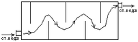 Сточную воду тангенциально подают внутрь гидроциклона. При вращении жидкости под действием центробежной силы внутри гидроциклона образуется ряд потоков. Жидкость, войдя в цилиндрическую часть, приобретает вращательное движение и движется около стенок по винтовой спирали вниз к сливу. Часть ее с крупными частицами удаляется из гидроциклона. Другая часть (осветленная) поворачивает и движется вверх около оси гидроциклона.