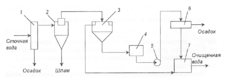 1 — решетка; 2 — гидроциклон; 3 — уплотнитель осадка; 4, 7 — емкости; 5 — насос; 6 — центрифуга