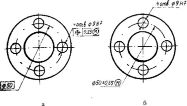Рис. 21. Примеры обозначения допусков расположения осей отверстий фланцевого соединения
