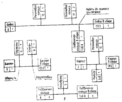 Если отдельные сборочные единицы (узлы) подвергаются по условиям общей сборки частичной или полной разборке (например, шатун с поршнем при установке в компрессор), то этот вид дополнительных работ также отражается дополнительной надписью на технологической схеме общей сборки.