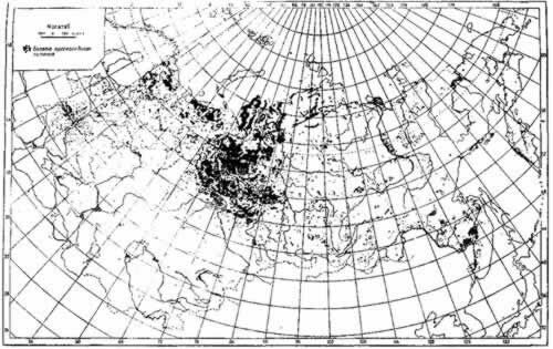 Рис. А. Схематическая карта распространения болот на территории СССР (по В. В. Куприянову). [4]