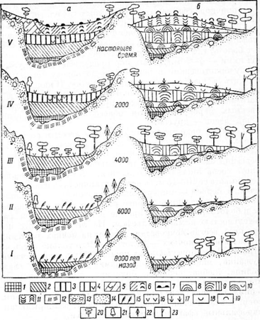 1-V — стадии развития болот. 1 — сапропель; 2—11 — торф: 2 — низинный, 3 — переходный древесный, 4 — переходный древесно-осоковый, 5 — переходный осоково-сфагновый, 6 — вертикального напластования (под грядами - переходный сфагновый, под мочажинами — низинный осоковый), 7 — переходный сфагновый под кочками, 8 — верховой пушицевый, 9 —верховой древесно-пушицевый, 10 — верховой пушицево-сфагновый, 11 — верховой вертикального напластования (под грядами — сфагновый фускум, под мочажинами — сфагновый мочажинный); 12 — глина; 13 — морена; 14 —_песок, 15—23 — растения: 15 — тростник, 16 — осоки, 17 — пушица влагалищная, 18 — сфагны мочажинные олиготрофные, 19 — сфагны грядовые олиготрофные, 20 — сосна, 21 — береза, 22 — ель, 23 — сухостой деревьев.