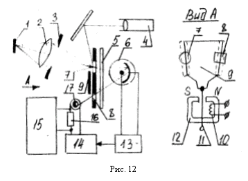 На (рис. 2) приведена схема фотоэлектрического пирометра. Поток от излучателя 1 линзой 2 и диафрагмой 3 объектива фокусируется на отверстии 7 в держателе светофильтра 5 таким образом, чтобы изображение визируемого участка поверхности излучателя перекрывало данное отверстие. В этом случае величина светового потока, падающего на катод фотоэлемента 6, расположенного за светофильтром, определяется яркостью излучателя, т. е. его температурой. В держателе светофильтра расположено еще одно отверстие 8, через которое на фотоэлемент попадает поток от лампы обратной связи 17. Световые потоки от излучателя 1 и лампы 17 подаются на катод попеременно с частотой 50 Гц, что обеспечивается с помощью вибрирующей заслонки 9. Возвратно-поступательное движение заслонки обеспечивается с помощью катушки возбуждения 10 и постоянного магнита 12. В вибраторе происходит перемагничивание стального якоря 11, который с частотой 50 Гц поочередно притягивается полюсами магнита 12 и перемещает заслонку 9. При различии световых потоков излучателя 1 и лампы 17 в токе фотоэлемента появится переменная составляющая, имеющая частоту 50 Гц и амплитуду, пропорциональную разности данных потоков. Усилитель 13 обеспечивает усиление переменной составляющей, а фазовый детектор 14 последующее ее выпрямление. Полученный выходной сигнал подается на лампу, что вызывает изменение силы тока накаливания. Это будет происходить до тех пор, пока на катоде фотоэлемента световые потоки от двух источников не уравняются. Следовательно, ток лампы обратной связи однозначно связан с яркостной температурой объекта измерения. В цепь лампы 17 включено калиброванное сопротивление 16, падение напряжения на котором пропорционально силе тока и измеряется быстродействующим потенциометром 15, снабженным температурной шкалой. Окуляр 4 обеспечивает наводку устройства на объект измерения. [4]
