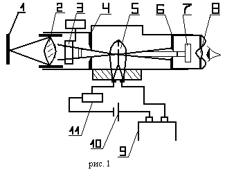 На (рис. 1) представлена схема оптического пирометра с "исчезающей" нитью, принцип действия которого основан на сравнении яркости объекта измерения и градуированного источника излучения в определенной длине волны. Изображения излучателя 1 линзой 2 и диафрагмой 4 объектива пирометра фокусируется в плоскости нити накаливания лампы 5. Оператор через диафрагму 6 линзу 8 окуляра и красный светофильтр 7 на фоне раскаленного тела видит нить лампы. Перемещая движок реостата 11, оператор изменяет силу тока, проходящего через лампу, и добивается уравнивания яркости нити и яркости излучателя. Если яркость нити меньше яркости тела, то она на его фоне выглядит черной полоской, при большей температуре нити она будет выглядеть, как светлая дуга на более темном фоне. При равенстве яркости излучателя и нити последняя "исчезает" из поя зрения оператора. Этот момент свидетельствует о равенстве яркостных температур объекта измерения и нити лампы. Питание лампы осуществляется с помощью батареи 10. Прибор 9, фиксирующий силу тока, протекающего в измерительной цепи, заранее проградуирован в значениях зависимости между силой тока и яркостной температурой абсолютно черного тела, что позволяет производить считывание результата в 0С. [4]