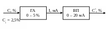 Задание. Измерительная цепь состоит из газоанализатора на СО с диапазоном измерения 0-5% и основной приведенной погрешностью 5%. Выходной сигнал газоанализатора 0-20 мА подается на вторичный прибор с основной приведенной погрешностью 0,5%. Определить относительную погрешность цепи при измерении концентрации 2,5% СО.