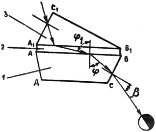 Показатель преломления прозрачных сред следует измерять в проходящем свете, а полупрозрачных и мутных - в отражённом. Для этого несколько капель исследуемой жидкости помещают между двумя гипотенузными гранями АВ призмы 1 и