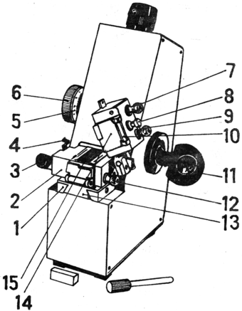 Для подсветки шкалы 16 и окраски поля зрения служат зеркало 13 и светофильтр 14.