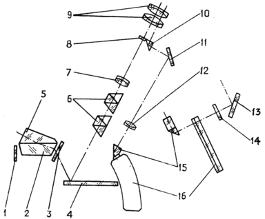 1 - зеркало; 2 – призма измерительная; 3 - стекло защитное; 4 - зеркало; 5 - призма осветительная; 6 – компенсатор; 7 - линза склеенная; 8 - сетка; 9 – окуляр; 10 - призма АР-90º; 11 - зеркало; 12 – объектив; 13 - зеркало; 14 - светофильтр; 15 – призма; 16 – шкала