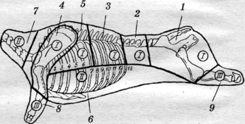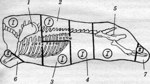 Цифрами I, II, III обозначены сорта; 1 - тазобедренный отруб; 2 -поясничный отруб; 3 - спинной отруб; 4 - лопаточный отруб; 5 -подплечный край; 6 - грудной отруб с пашиной; 7 - шейный отруб; 8 - предплечье; 9 - голень