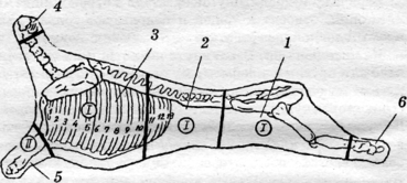 Цифрами I, II обозначены сорта; 1 - тазобедренный отруб; 2 - поясничный отруб (включая пашину); 3 - лопаточно-сшшной отруб (включая грудинку и шею); 4 - зарез; 5 - предплечье; 6 - голяшка